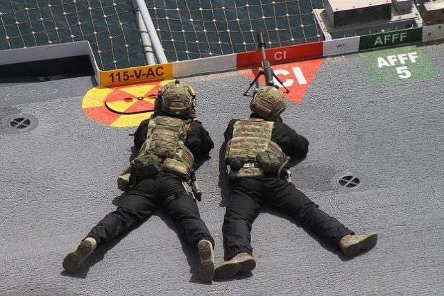 Además, como suele ser habitual, un equipo de tiradores de precisión situado desde el navío de la Armada desde donde se organiza el asalto ha apoyado la operación, es. En este caso el equipo, formado por el observador o spotter y el tirador se posicionaba en la cubierta de vuelo del “Juan Carlos I”. (Julio Maíz Sanz)