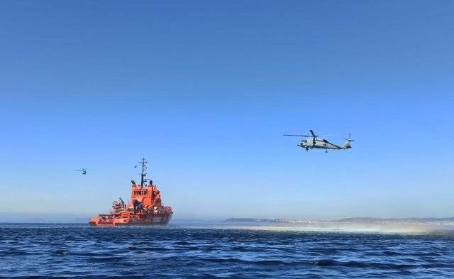 Fotografía: Helicópteros de la Armada se dirigen al buque de salvamento “María Pita”. (foto: Armada)