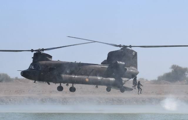 Fotografía: Personal del MOE saltando al rio Guadalquivir desde un “Chinook” de las FAMET. (foto: MOE)
