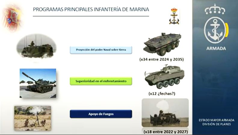 El marido también adelantó el periodo de reequipamiento, que será entre 2024 y 2035, y que servirá a la Infantería de Marina para, por fin, poder renovar la más que veterana flota, recibida en los años setenta del pasado siglo, de vehículos de asalto anfibio o Assault Amphibious Vehicle (AAV), de los que actualmente tiene 19 AAV-7A1 (16 en versión portapersonal, dos de mando y uno de recuperación).