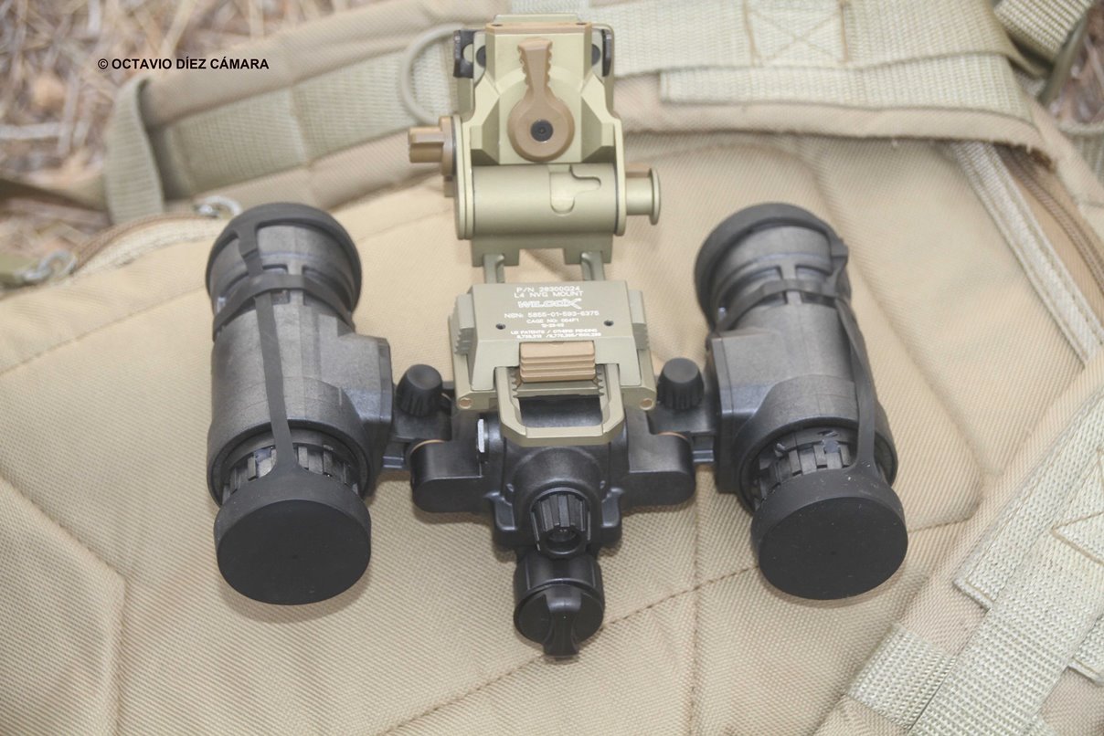 Las gafas nocturnas permiten a ese personal de Operaciones Especiales una mejor comodidad en sus movimientos. Lo hacen al incorporar tubos captadores que son más compactos y ligeros que otros anteriores y por contar con una montura G24 L4 NVG de la compañía estadounidense Wilcox, que sólo pesa 162 gramos, incluye un anclaje para fijarla en la parte delantera del casco y puede plegarse con comodidad para poder situar el elemento binocular de la gafa nocturna en una posición de transporte más cómoda cuando no se usa.