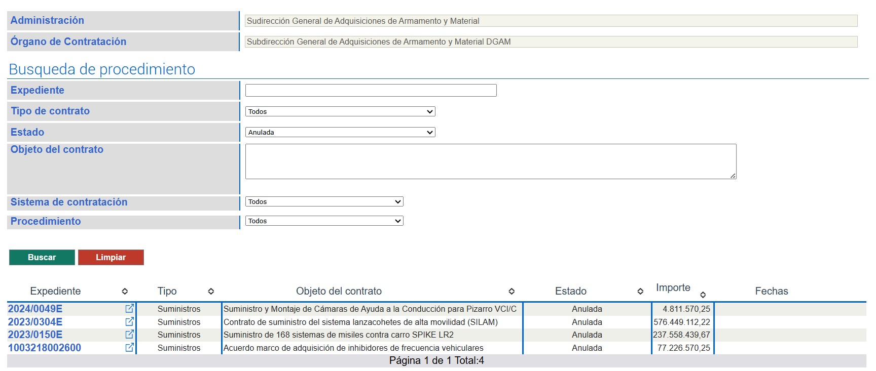 Cabe destacar que de los únicos expedientes anulados de los que se puede obtener algo de información son el del SILAM y el del Spike LR2, que aparecen anulados pocos minutos antes de las 16.00, firmados electrónicamente por el subdirector general de Adquisiciones de Armamento y Material, José Maria Belluga Capilla. Pocos minutos después ya estaban disponibles en la Plataforma de Contratación del Estado.
