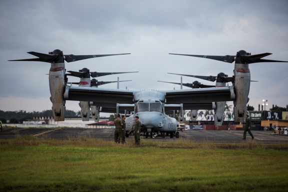 ·Tres de los convertiplanos Bell-Boeing MV-22B “Osprey” del SP-MAGTF CR durante su reciente despliegue en Liberia. (Fotografía: USMC)