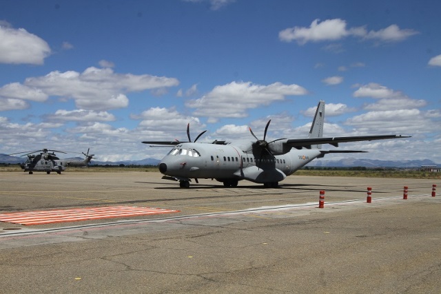 ·El Ejército del Aire desplegó en León un transporte táctico Airbus DS C295 y un helicóptero AS332B. (foto: Julio Maíz/defensa.com)