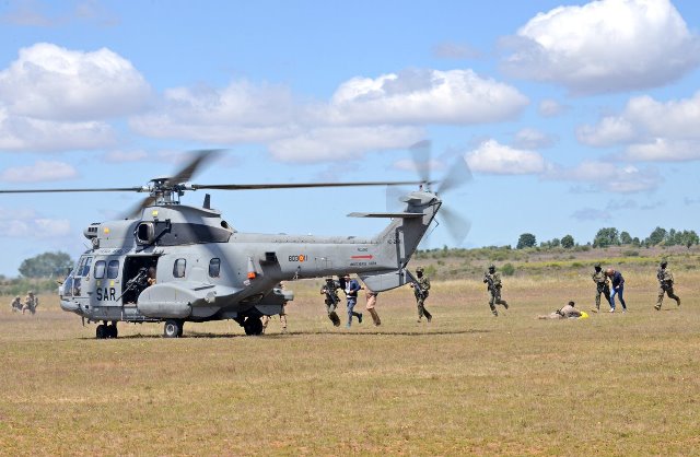 ·En el SOFEX-19 se realizaron todo tipo de supuestos, como este de extracción de agentes del CNI (Centro Nacional de Inteligencia), mediante un helicóptero AS332B “Super Puma”. (foto: EMAD)
