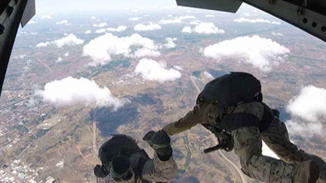 ·Espectacular imagen de personal de la FGNE (Fuerza de Guerra Naval Especial) de la Armada saltando desde un C295 del Ejército del Aire a 14.000 pies de altura. (foto: FGNE)