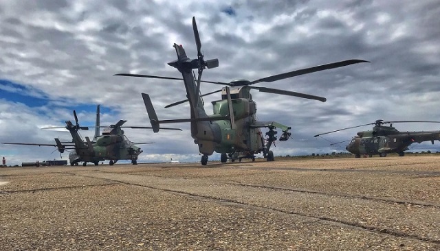 ·Parte del material aeronáutico empleado, en primer término dos Airbus Helicopters “Tigre”. (foto: EMAD)