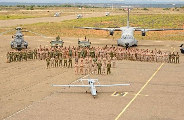 Fotografía: Presentación de parte del personal y el material participante, en el centro plataforma aérea de pilotaje remoto IAI “Searcher” perteneciente al GROSA (Grupo de Obtención de Sistemas Aéreos) del ET. (foto: EMAD)