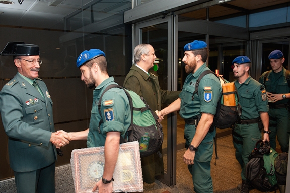 El lunes regresaban a España, tras seis meses, 24 guardias civiles integrantes de esta sección, que, como parte de las fuerzas de EUFOR, han colaborado en el establecimiento de un entorno seguro en su área de operaciones con el resto de fuerzas internacionales, así como con las autoridades y fuerzas de seguridad locales en la capital de la República, Bangui. Este grupo daba inicio a la misión, formando parte del primer contingente y permaneciendo desplegado durante un período que no ha estado exento de vicisitudes, como la emboscada que sufrieron a finales de julio mientras realizaban una patrulla y de la que salieron ilesos.