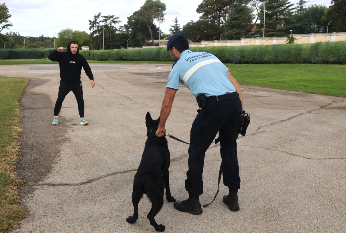 Durante nuestra visita, pudimos observar en el Cuartel de El Rey un ejercicio práctico de control de vehículos protagonizado por miembros de la Compañía de Control Militar. En el simulacro se desplegaron señalizaciones, se efectuó el registro de un vehículo y se contó con el apoyo de un binomio cinológico de la Sección de Perros, integrada también en la Compañía. El entrenamiento incluyó la participación de una unidad de reacción compuesta por un pelotón de la Compañía de Alabarderos, que, junto al Escuadrón de Escolta Real, la Batería Real y la citada Compañía de Control Militar conforman el Grupo de Escoltas.