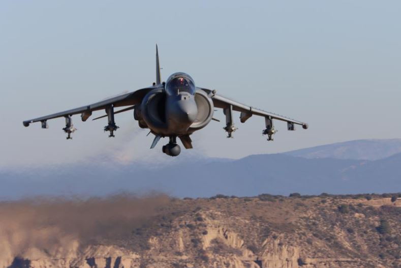 Uno de los veteranos “Harrier”, equipado con el designador AN/AAQ-28(V), sobrevolando el polígono de tiro de Bardenas Reales. (foto Armada)