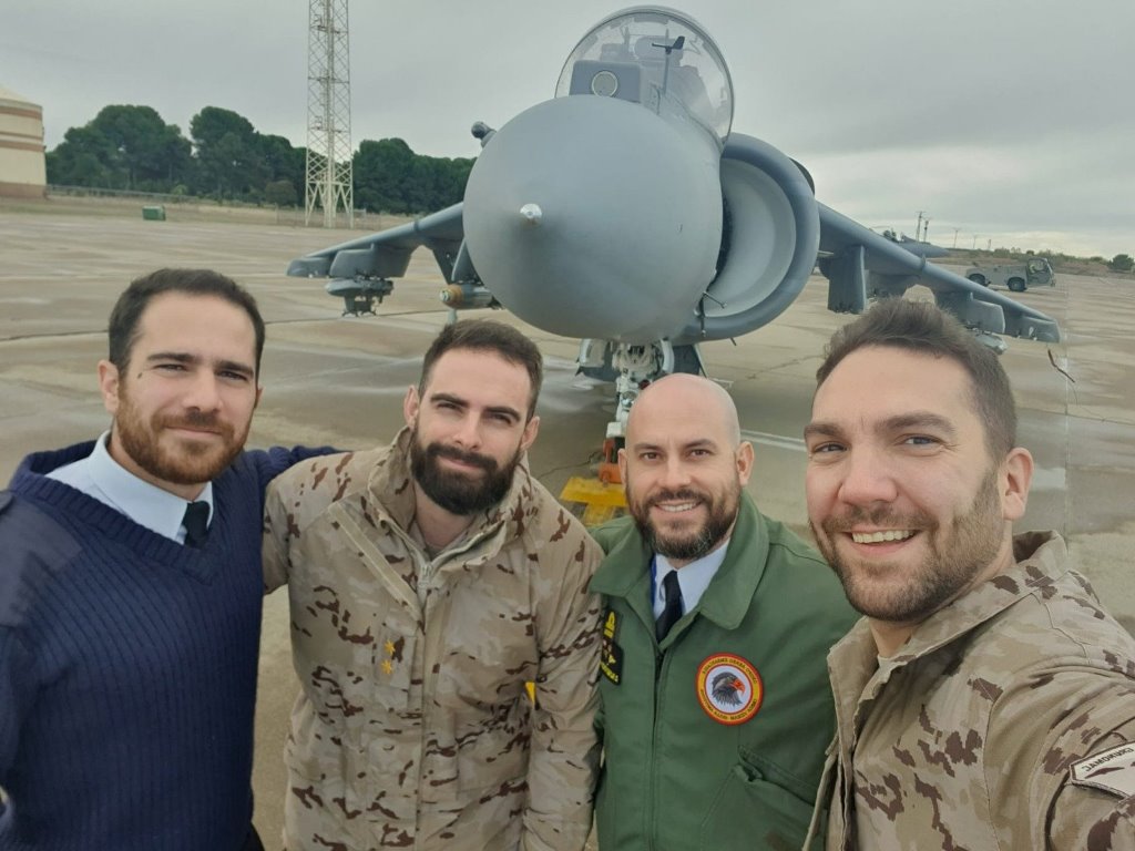 Controladores aéreos del Grupo Norte del Ejército del Aire y del Espacio y de la FLOAN delante de un “Harrier”. (foto Armada)