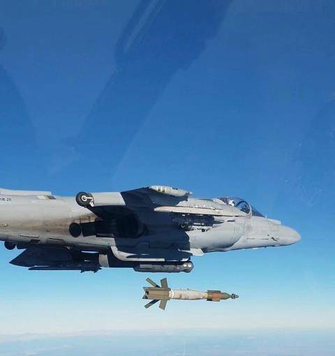 La GBU 12 (por Guided Bomb Unit) es una bomba de guiado láser resultado de combinar el cuerpo de una bomba convencional de aviación de 500 libras (227 kg.) y un sistema de guiado láser del tipo Paveway II, obteniendo un arma precisa y con casi 15 km de alcance. El empleo de esta y la GBU-38 JDAM (Joint Direct Attack Munition) (también de 500 libras) de guiado GPS e inercial se ve facilitado por el empleo de los lanzadores triples BRU-70/A de cuya adquisición informamos en 2015. De esta forma los Harrier de la Armada pueden transportar hasta seis bombas de precisión GBU-38 o GBU 12 Paveway II o combinaciones de estas. (José Mª Navarro García)