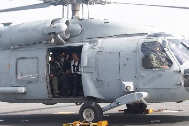 El SH-60F aterrizando en la cubierta del “Juan Carlos I”, con SM Felipe VI a bordo. (foto Casa Real)
