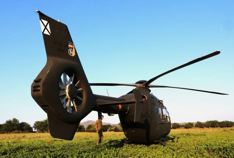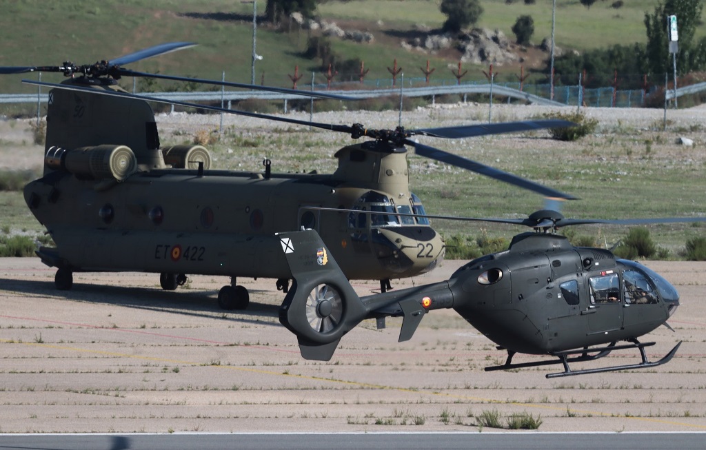 Despegue para el desfile aérea de un H135 de las ACAVIET, al fondo un CH-47F del BHELTRA V. (foto Julio Maíz Gutiérrez)