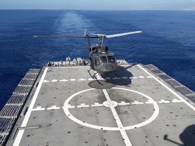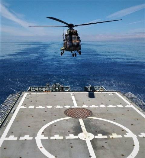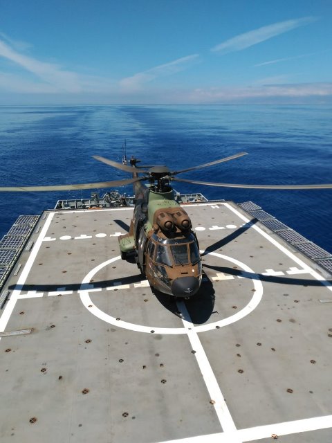 ·El AS332B del BHELMA VI posado en la cubierta de vuelo del “Relámpago”. (foto: Mando de Canarias).