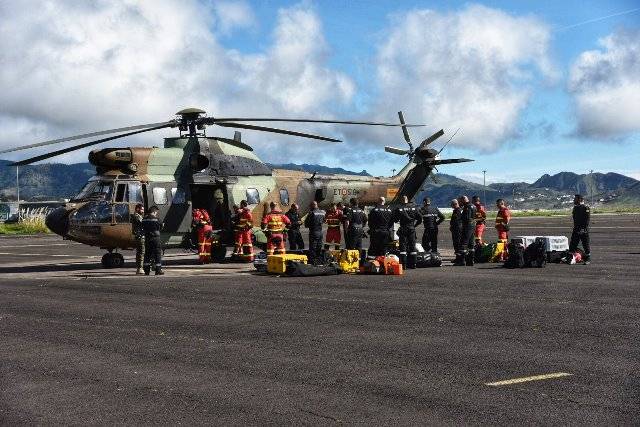 La pasada semana, efectivos de la UIEN Canarias de Tenerife realizaron un ejercicio de instrucción, con el objetivo de reforzar los protocolos de colaboración con el MCANA (Mando de Canarias) del Ejército de Tierra, en el que está encuadrado el BHELMA VI, para afrontar cualquier incidente que se pudiese ocasionar en alguna de las islas. Así, desde la zona aeronáutica del Acuartelamiento de Los Rodeos, personal del destacamento de la UIEN Canarias, que forma parte del segundo Batallón de Intervención en Emergencias (BIEM II) que tiene su principal base en Morón (Sevilla), se embarcó junto con sus voluminosos equipos en 2 helicópteros AS-332 Super Puma (HU-21) del BHELMA VI, cubriendo la distancia hasta la isla de La Palma en 45 minutos, unos 150 kilómetros sobre el Océano Atlántico.