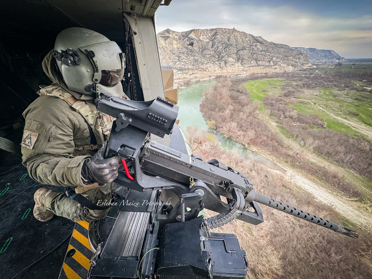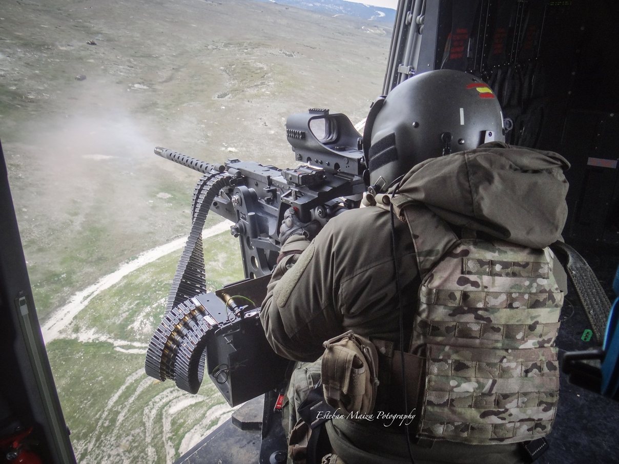 Un tirador de NH90 del BHELMA III haciendo fuego a objetivos en tierra con la ametralladora pesada M3M Browning. (Esteban Maiza)