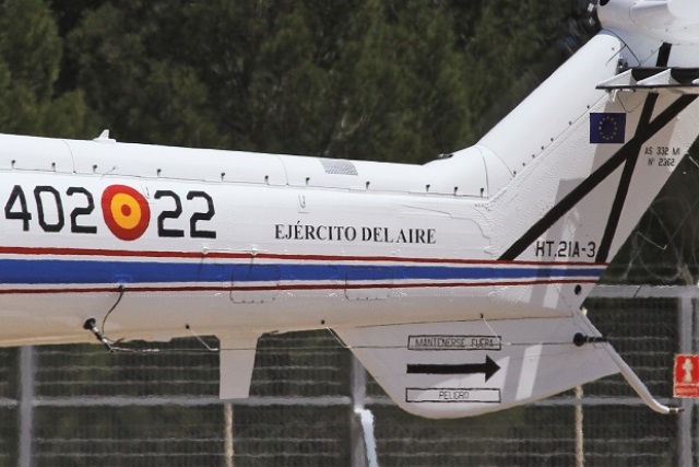Sin embargo, acabamos de ver en la plataforma de la factoría de Airbus Helicopters España (AHE), sita en Albacete, uno de los helicópteros AS332M1 del Escuadrón, en concreto el matriculado HT.21A-3 402-23, recién pintado en el que se aprecia que ya lleva pintado el título “Reino de España” en la referida posición. Además tampoco se ha olvidado la designación de “Ejército del Aire”, aunque ahora va pintada en la cola, justo detrás del numeral de unidad, como se aprecia en la foto nº 2. Igualmente en la foto se puede apreciar que se ha pintado una pequeña bandera de la Unión Europea, en la parte final de la cola, al igual que en los referidos aviones VIP.