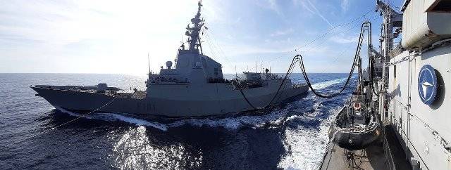 Fotografía: El “Patiño”, con la estrella de la OTAN fijada en su castillo de proa, suministra combustible a la fragata “Álvaro de Bazán”. (foto: Armada)