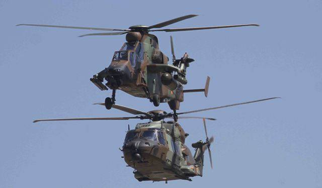 ·Pasada en formación de un Tigre (arriba) y un NH90 de las FAMET. Foto: Julio Maíz/defensa.com.
