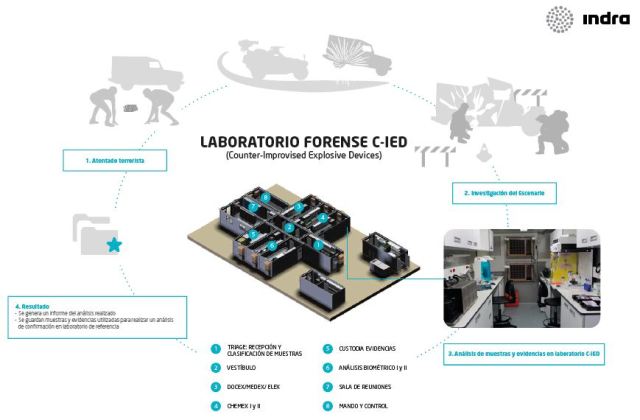 Indra se adjudica este nuevo contrato con la EDA después de que la agencia ya le encomendase el desarrollo de un primer laboratorio C-IED que ha respaldado con éxito la actuación de las fuerzas ISAF en Afganistán desde agosto de 2011 hasta su retirada a finales del 2014. Durante este periodo, el laboratorio llevó a cabo más de 300 análisis cada mes de aparatos, artefactos, materiales, y trazas relacionadas con ataques. Esta experiencia ha permitido incorporar numerosas mejoras en el diseño de los nuevos laboratorios, entre las que destacan: mayor capacidad de recogida preliminar de muestras de alta peligrosidad, mayor capacidad de análisis documental y de análisis químico y biométrico.