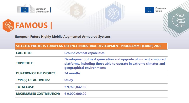 El programa FAMOUS, en el que participan 19 empresas europeas, aborda el diseño de arquitectura y sentará las bases para el posterior desarrollo y fabricación de un todoterreno oruga y un vehículo blindado ligero de ruedas para infantería, que podrían entrar en operación a finales de esta misma década y que estarán dotados de tecnologías disruptivas.