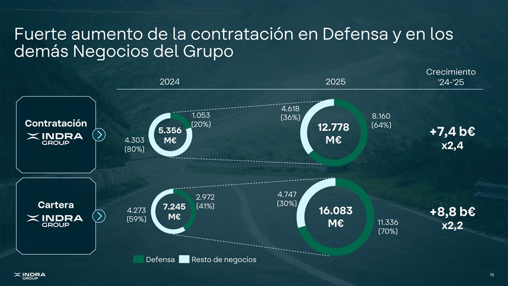 La cartera del mercado de Defensa de Indra Group alcanza los 11.336 millones de euros en 2025, un 281% más y por encima del objetivo de más de 10.000 millones fijado inicialmente para 2026. De esa cifra, 6.790 millones proceden de los nuevos Programas Especiales de Modernización (PEM) aprobados por el Gobierno en el último trimestre y 1.429 millones de la consolidación de TESS Defense; excluyendo estos impactos, la cartera de Defensa crece un 5%.