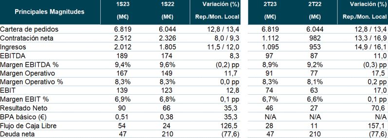 El EBITDA reportado en el 1S23 ascendió a 189 M€ vs 174 M€ en el 1S22, mostrando un crecimiento del 8,3%, y equivalente a un margen EBITDA del 9,4% en el 1S23 y del 9,6% en el 1S22. Si nos centramos solo en el segundo trimestre del año, el EBITDA ascendió a 97 M€ vs 87 M€ en el mismo periodo del ejercicio anterior (equivalente a un margen del 8,9% ahora frente al 9,2% del 2022).