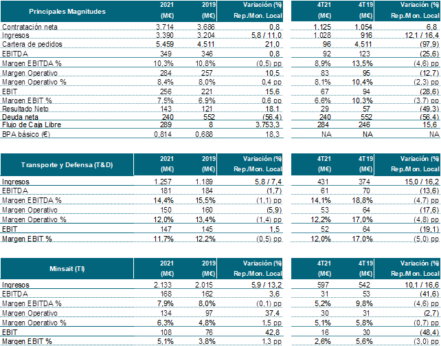 - El Margen EBIT de Transporte y Defensa se situó en el 11,2% en 2021 excluyendo la plusvalía por la venta de las instalaciones y la provisión del plan de inmuebles frente al 7,3% en 2020, excluyendo el impacto de las provisiones del plan de acción y la plusvalía por la venta de Metrocall, y frente al 12,2% en 2019.