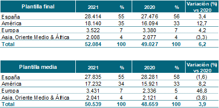 La plantilla final al cierre de 2021 estaba formada por 52.084 empleados, lo que ha supuesto un incremento del 6,2% frente a 2020 (3.057 empleados más), concentrándose ese incremento en América (2.046 empleados más) y en España (938 empleados más). En el trimestre, la plantilla final al cierre de diciembre de 2021 aumentó un 1,5% respecto a septiembre de 2021 (774 empleados más). Por su parte, la plantilla media en 2021 aumentó un 3,9% respecto a 2020.