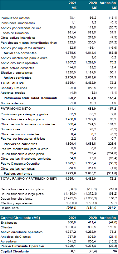 La Deuda Neta se redujo hasta los 240 millones de euros en diciembre de 2021 frente a 503 millones en septiembre de 2021 y 481 millones en diciembre de 2020. La ratio de Deuda Neta/EBITDA de los últimos doce meses (excluyendo el impacto NIIF 16, la plusvalía por la venta de las instalaciones y la provisión del plan de inmuebles) se situó en 0,8 veces en diciembre de 2021 frente a 1,7 veces en septiembre de 2021 y 2,5 veces en diciembre de 2020.