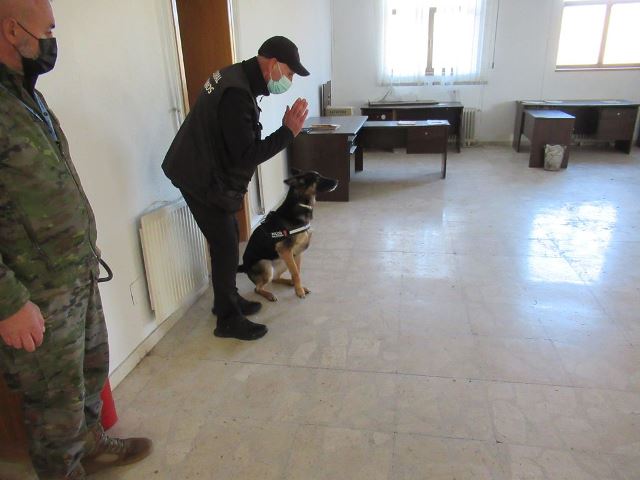 Otro de los perros espera instrucciones tras señalar donde está el explosivo (INTA)