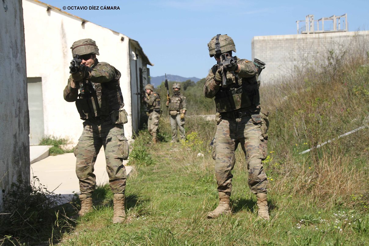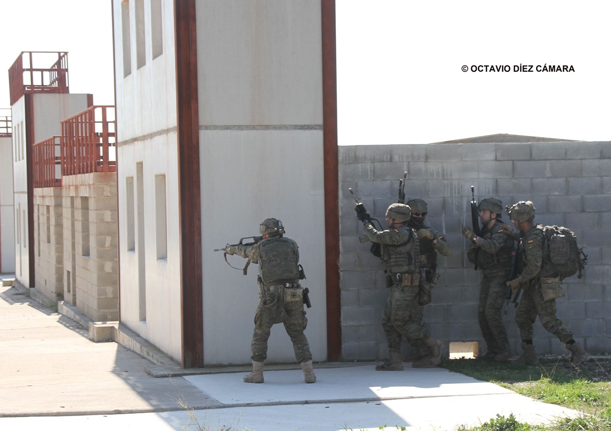 En simulacros de lucha en zonas urbanizadas los pelotones son transportados a bordo de los vehículos de combate de Infantería (VCI) Pizarro de la Fase 1 a las inmediaciones del excelente polígono urbano que se ha construido en el Acuartelamiento General Álvarez de Castro, donde se asienta el Badajoz I/62. Tras desplegar desde sus ingenios acorazados, se desplazan a pie recorriendo el espacio y limpiando, una a una y de forma secuencial, las edificaciones, una progresión en la que tienen que actuar para eliminar la amenaza opositora realista, materializada por otros militares del Ejército de Tierra.