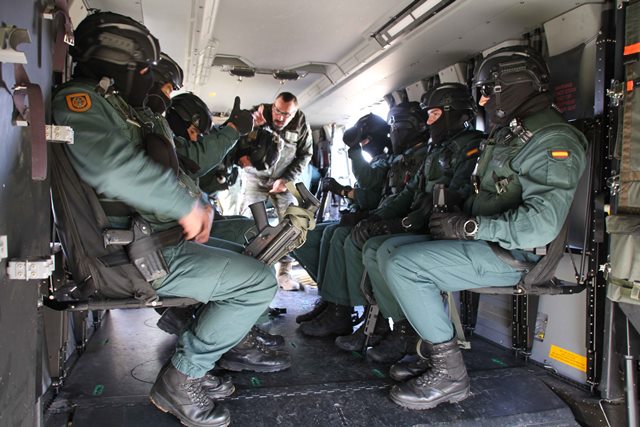 -Personal del GAR en los helicópteros con los que se infiltrarían hacia el objetivo programado para liberar un piloto que había sido capturado por terroristas. (Octavio Díez Cámara)