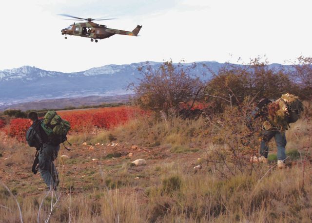 Por ese motivo, Jabalí 2019 ha contemplado un supuesto en el que el piloto de una aeronave que caía en territorio enemigo era capturado por un grupo de terroristas que lo retenían. Para liberarlo, sano y salvo, se preparó una arriesgada y difícil misión de localización y rescate. En la mañana del día 18 de noviembre tuvo lugar una primera reunión de coordinación en la Base del BHELMA para trabajar distintos aspectos de la práctica. El día 19 un Equipo de Despliegue Rápido (EDR) del GAR, de algo más de veinte efectivos, realizó prácticas de embarque y desembarque en los NH90 para conocer procedimientos y capacidades, pues era una plataforma con la que no tenían experiencia. Esa misma tarde, sobre las cinco, se realizó un vuelo por parte de dos de esos helicópteros para insertar a un pequeño grupo de reconocimiento formado por un binomio del Equipo de Tiradores de Precisión (ETP) del GAR y otro del BHELMA III; su cometido, infiltrarse a pie en una zona próxima a las instalaciones del Polígono de Experiencias de Fuerzas Especiales (PEFE) de la Benemérita, para intentar localizar a su objetivo, identificarlo y transmitir en tiempo real información para programar una compleja operación de liberación.
