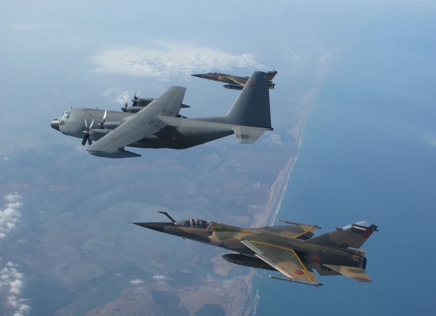Foto: Cazas Mirage F-1 escoltando un Hercules español en el curso de un ejercicio “Circaete”. Foto: Fuerza Aérea de Marruecos.