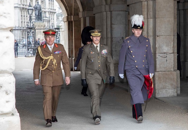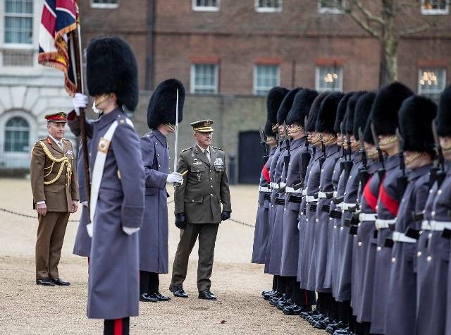 A su llegada, el general Alejandre fue recibido por una guardia de honor de los Scots Guards, un regimiento de infantería que forma parte de la división militar de la Casa Real Británica, en Horse Guards Parade, el corazón de las ceremonias militares en Londres.
