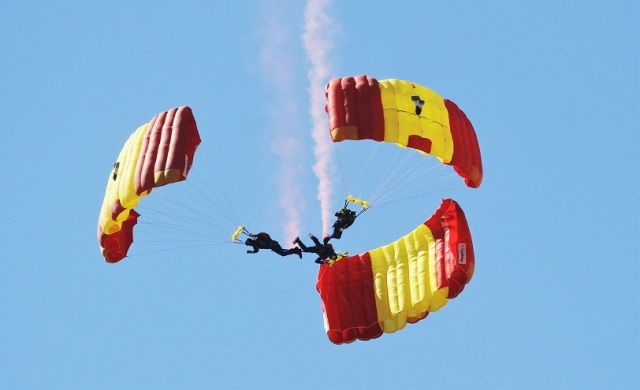 ·Los espectaculares saltos de la PAPEA, como éste en el que caen tres profesionales juntos, hasta casi llegar al suelo.