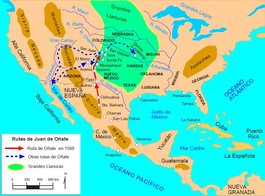 Juan de Oñate, descendiente de conquistadores y dotado de un buen patrimonio, organizó una gran expedición al norte de Nueva España. No encontró riquezas ni yacimientos minerales, pero descubrió un amplio territorio en las Grandes Llanuras; fundó San Juan de los Caballeros, primera ciudad en ese territorio; San Gabriel –primera capital del entorno–, y Santa Fe, nueva capital diez años más tarde; implantó nuevos cultivos en tierras norteamericanas e introdujo el ganado vacuno, ovino y caballar. Oñate dejó su sello personal en una inscripción que se conserva en El Morro (hoy Monumento Nacional), y el reconocimiento de su labor podemos verlo en la escultura ecuestre erigida en El Paso, Texas.