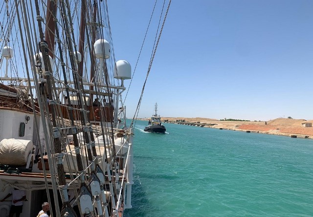 El “Juan Sebastián de Elcano” comienza a cruzar el Canal de Suez el 26 de mayo para adentrarse en el Mar Mediterráneo y comenzar el tránsito de vuelta a territorio nacional. Debido a las condiciones reinantes en la zona del Golfo de Adén y Mar Rojo no ha sido posible realizar la navegación a vela por lo que el buque se ha enfocado en el adiestramiento de los Guardiamarinas en otros ámbitos como la navegación costera por zonas con alta densidad de tráfico y el adiestramiento encaminado a garantizar la seguridad del buque.