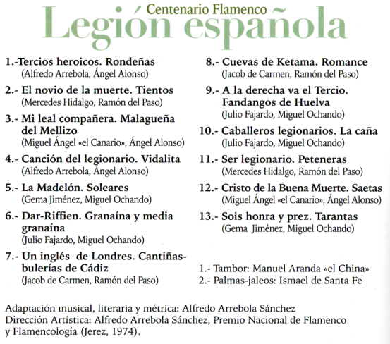 Con motivo de la celebración del Centenario de La Legión surgió la original idea de fusionar el cancionero legionario con el arte flamenco. Así, la Fundación "Tercio de Extranjeros", en colaboración con la Subdirección General de Publicaciones del Ministerio de Defensa, ha editado una obra, única en su género y con toda la pasión y sentimiento del flamenco, en homenaje a una Legión que lleva cien años levantando pasiones y generando sentimientos.