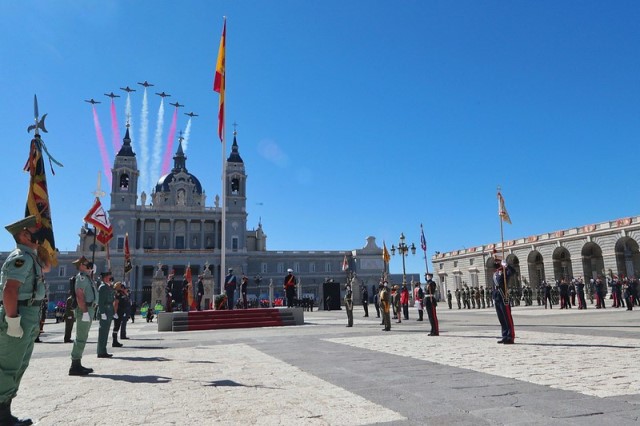 Tras el homenaje a los que dieron su vida por España, concluían los actos con el paso en vuelo de los siete aviones C-101 de la Patrulla Águila del Ejército del Aire sobre el Palacio Real. La ceremonia ha concluido con el desfile de las fuerzas que han rendido honores, en el que han tomado parte únicamente unidades ubicadas en Madrid, a excepción de La Legión que, con motivo de su centenario, ha tenido un especial protagonismo. Los efectivos del Tercio, a nivel de compañía con Escuadra, Música y Banderines de todas las unidades de la Brigada de la Legión, participaron en el posterior desfile con su paso específico y característico.