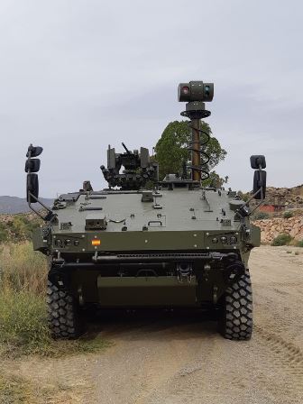 Además del citado mástil telescópico con el bloque sensor de Navantia, se aprecian la Guardian 2.0 dotada de paneles de blindaje, los sistemas de ayuda a la conducción y de Indra en las esquinas del vehículo las cámaras perimetrales, también de Indra, receptores de alerta láser E-LAWS 2 de Elbit Systems, un sistema de comunicaciones vía satélite en movimiento (SatCom on the Move), un sistema de alerta acústica Pilar V de Metravib, así como diferentes antenas de comunicaciones para aplicaciones concretas. (José Mª Navarro García)