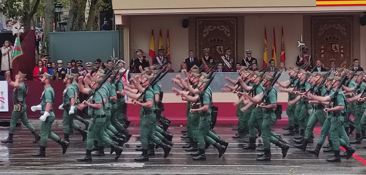 Más de 4.000 militares han desfilado el 12 de octubre por el madrileño Paseo del Prado con motivo del Día de la Fiesta Nacional de España bajo una intensa y continua lluvia que obligó de una manera excepcional a las unidades de paso específico del Ejército de Tierra español, la Legión y los Regulares, a hacerlo al ordinario del resto de las Agrupaciones a pie.