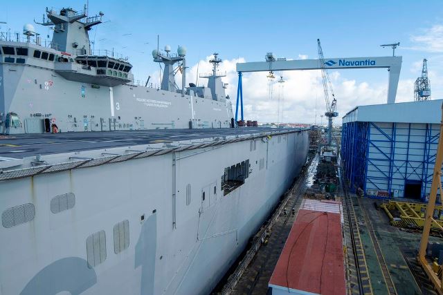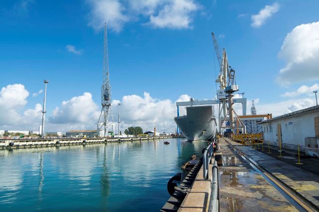 Allí permanecerá previsiblemente hasta el 27 de diciembre, una vez que se hayan completado trabajos que incluyen la mejora del sistema de propulsión, repintado generalizado, revisión de las aletas estabilizadoras, hélices de maniobra, control del estado de las válvulas de fondo, colectores antiincendios y aspiraciones, además de una completa inspección de tanques y otros espacios vacíos.