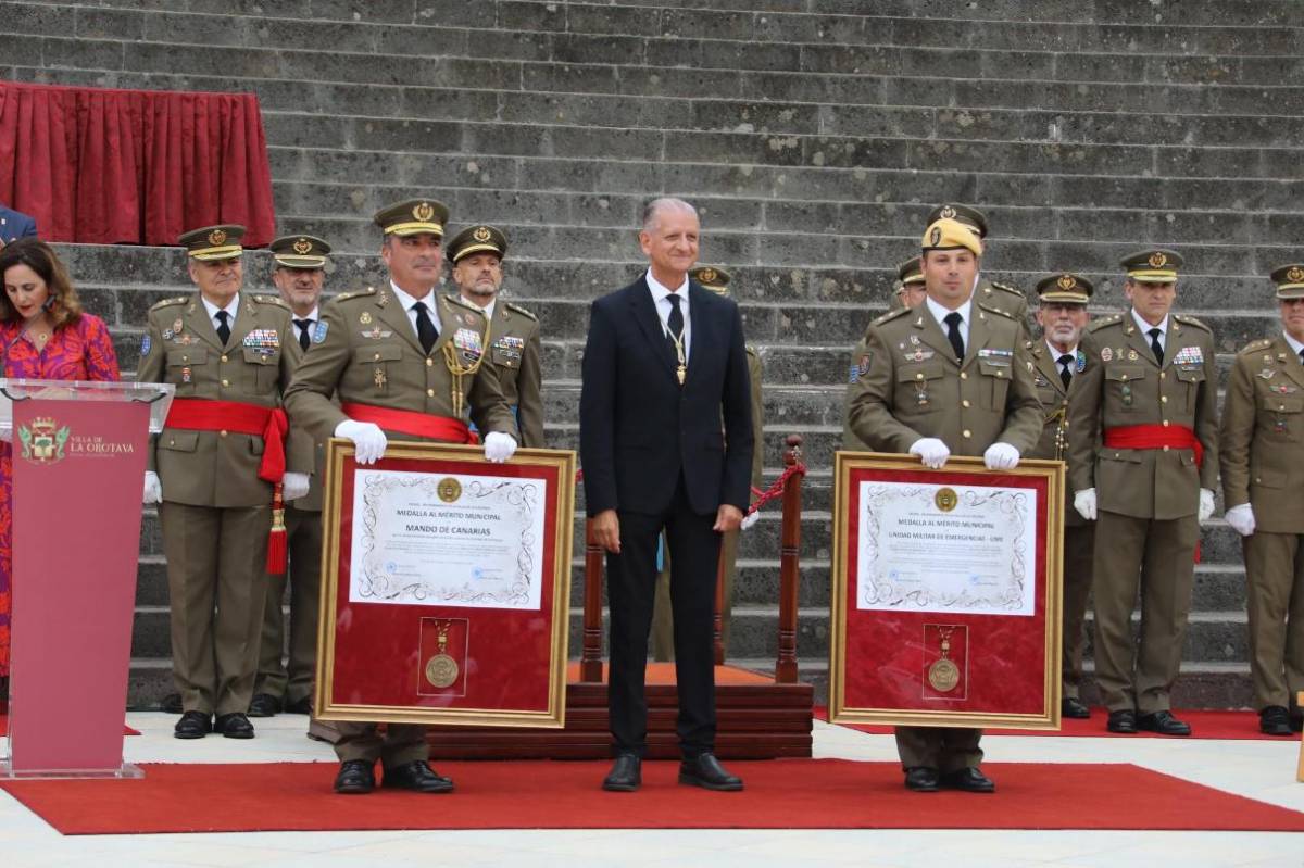 Reconociendo al Mando de Canarias del Ejército de Tierra y a la Unidad Militar de Emergencias (UME) su comportamiento ejemplar y ayuda y socorro al municipio durante los incendios que han afectado a La Orotava (Tenerife) en los últimos 40 años, el Ayuntamiento de La Orotava celebró un acto solemne para condecorar al Mando de Canarias y a la (UME) con la Medalla al Mérito Municipal.