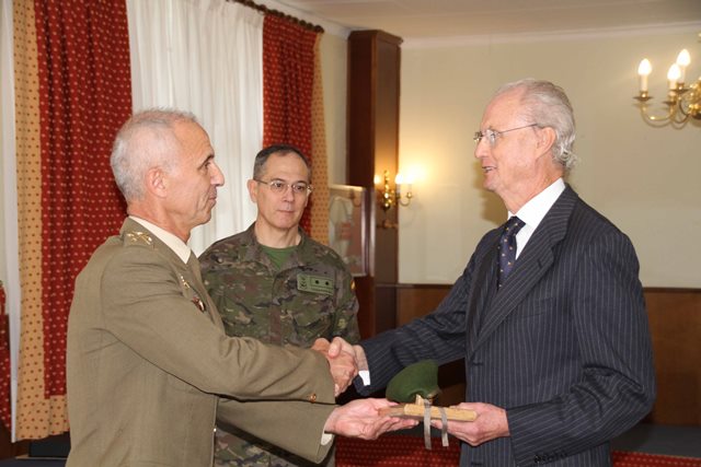 ·Pedro Morenés, que fuera Ministro de Defensa y ex embajador en Washington, recibe de la mano del general de División Jaime Íñiguez Andrade la boina verde de este premio.