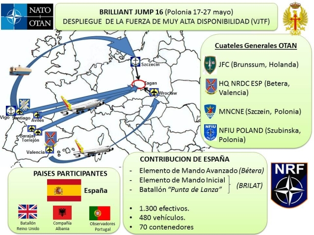 España, como nación líder de la VJTF durante 2016, es la nación que más efectivos aporta con más de 1.300 efectivos. El ejercicio ‘Brilliant Jump 16’ tendrá lugar en el campo de maniobras próximo a la localidad polaca de Zagan y finalizará el próximo 27 de mayo. Una vez finalizado, los militares españoles continuarán en Polonia hasta el 10 de junio, esta vez participando en el ejercicio ‘Valiant Falcon 16’, con la finalidad de adiestrar su empleo como fuerza de muy alta disponibilidad.