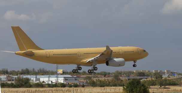 Fotografía: El primero de los A330 que serán reconvertidos en MRTT aterrizando en el aeródromo de Getafe, va todavía en imprimación y porta la matricula española EC-333, que una vez transformada será cambiada por otra provisional, MRTT, más un numeral.